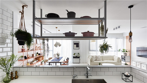 吊装的置物架,省空间又美美的,白色面包砖复古怀旧。