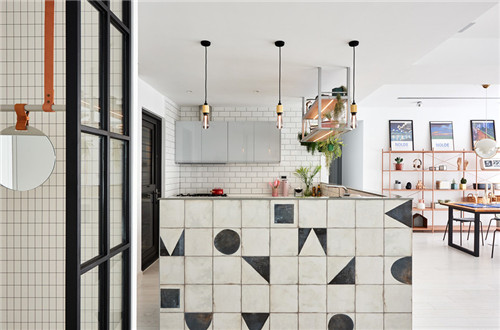 做旧的瓷砖让厨房看起来别有一番风情,黑色几何图案个性又有童趣。