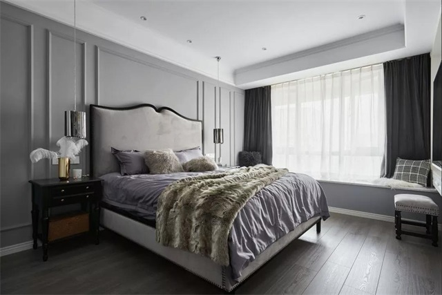 主卧去繁从简,保留了美式的设计,又省去了繁重的元素装饰。整个的空间简洁不简单,透亮宽敞。