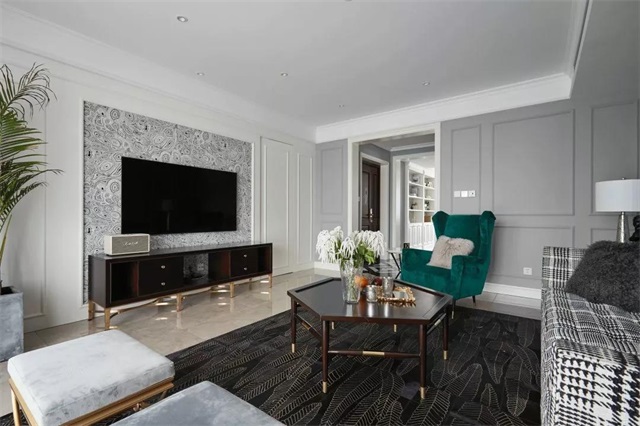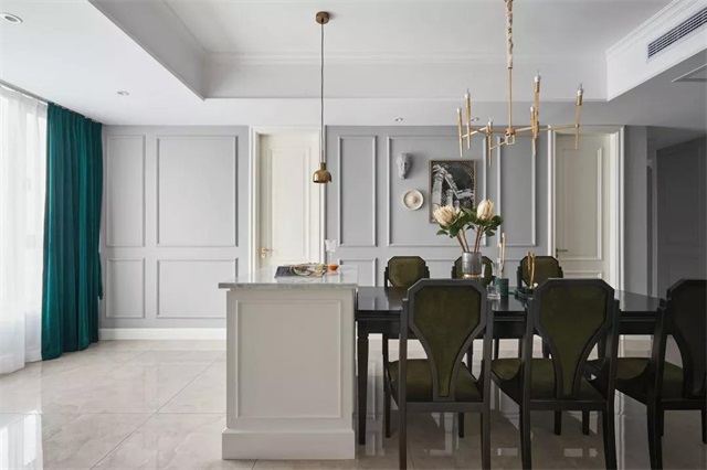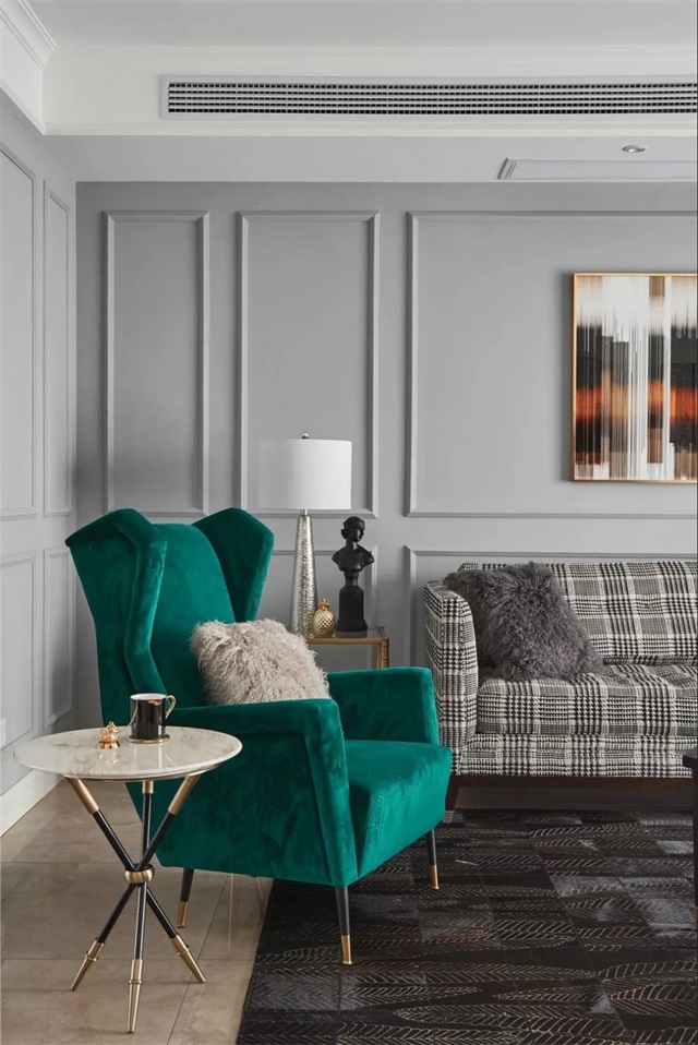 这处公寓在配色上主要以灰、白、黑为主要基调,配上点缀的墨绿色,给人一种稳重中带些时尚的特点。