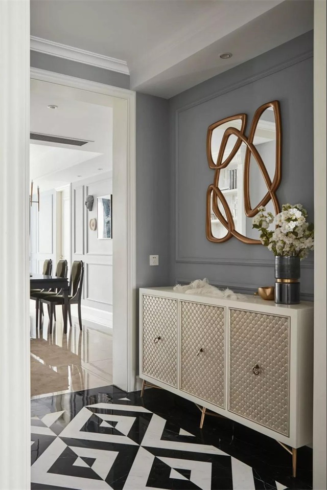 玄关处为了不显背景空白,设置了一面不规则的镜子装饰。米白色的鞋柜,配上细脚的装置,显得个性有格调。
