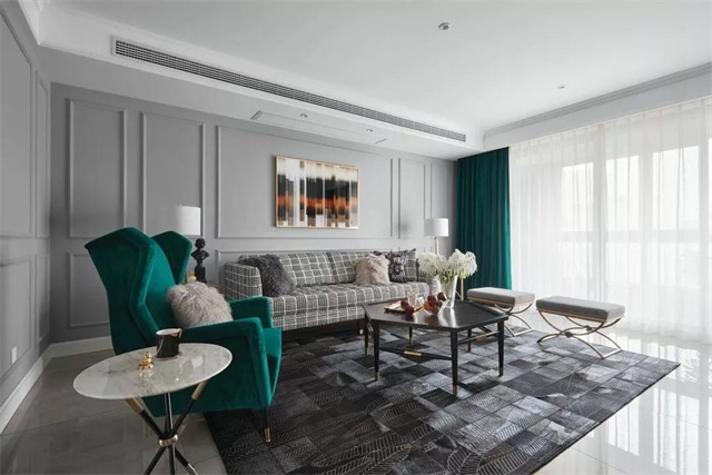 墨绿色的单人沙发和窗帘,巧妙地呼应。落地窗的设计,让整个客厅变得透亮和惬意。