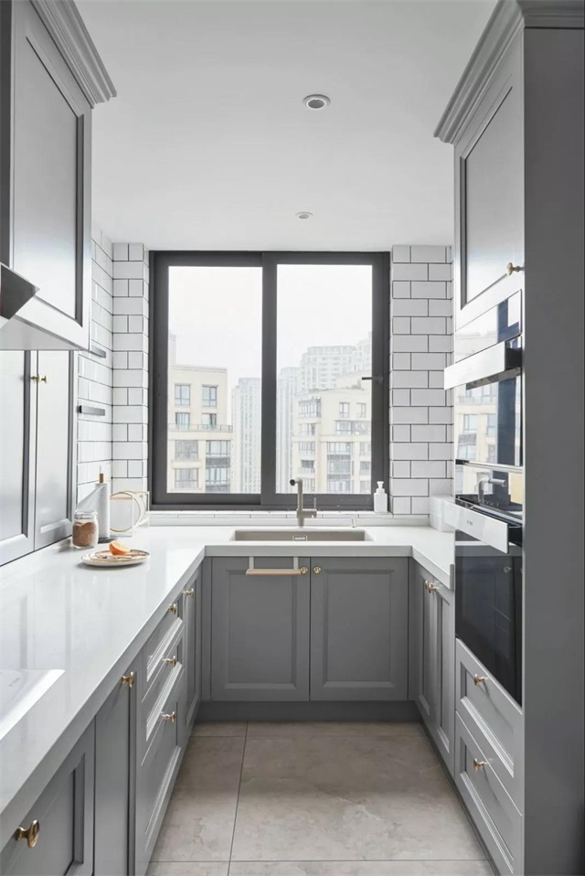 U型厨房,高级灰和白色碰撞的简单设计。吊柜和地柜,为主人增加了储物空间,保证厨房的整齐有序。嵌入式家电,不但节省了空间,还提升了厨房的品质和颜值。