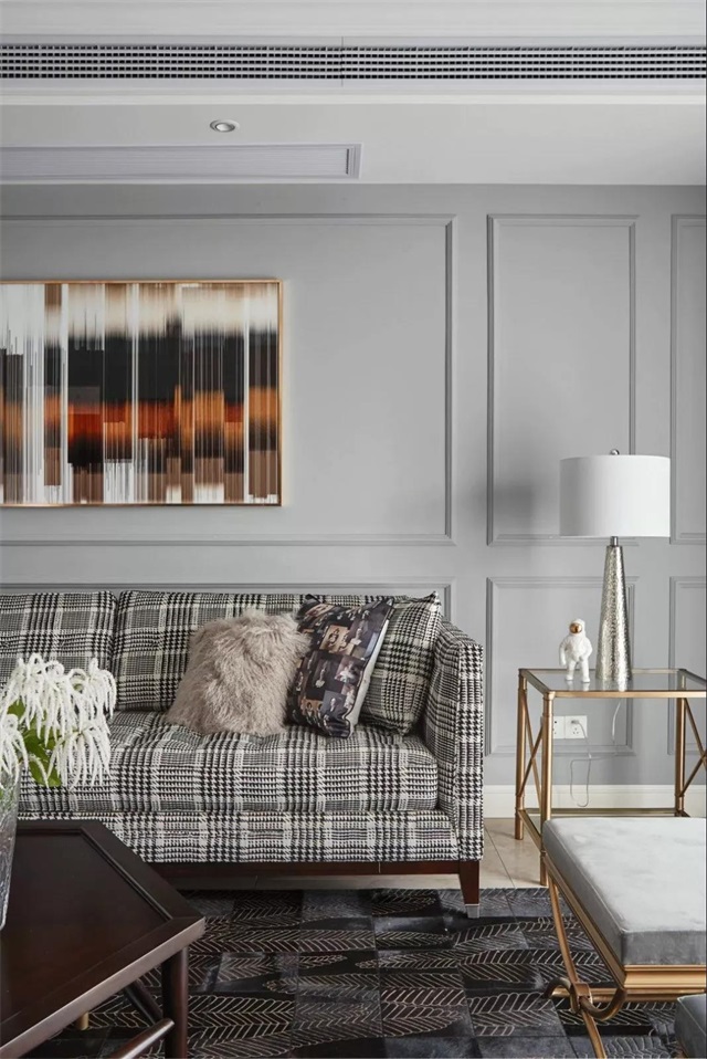 客厅的千鸟格沙发,与独特线条的黑色地毯,墙壁上个性的装饰画,大大小小的元素,散发出一种雅致和个性。
