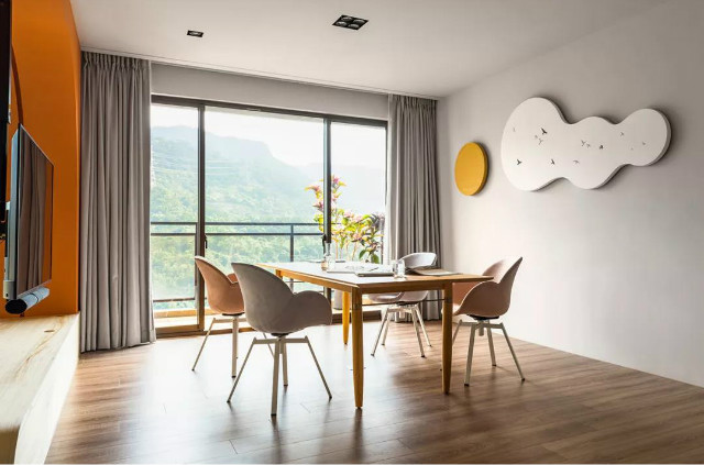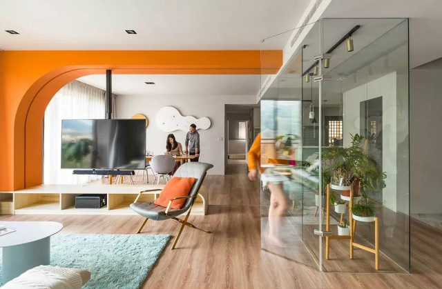公空间以开放式设计与对称手法开启敞朗视感,透过木地板的清晰山形纹呼应外在绵延山峦,显现自然纯粹的完美融合;经建筑结构技师评估后,将中央分户墙敲除,由一道刷覆鲜活亮橘的半圆弧造型墙取而代之,同步装设可360°旋转调整的悬吊式电视架,借此串连客厅与餐厨领域。