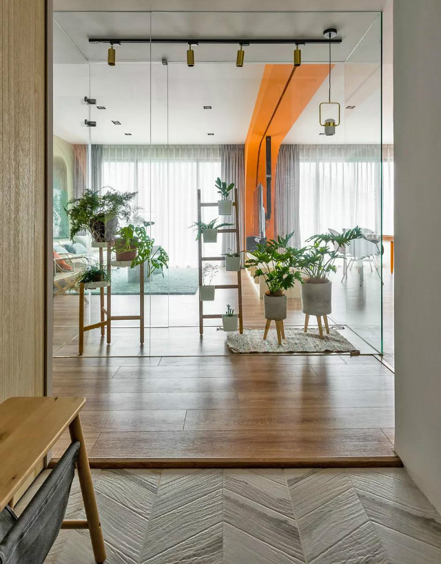 门旁靠墙一座直立高柜,采落地设计以便于未来收纳轮椅的需求,同时在底部设置一道引导灯,留给夜晚赋归的家人一抹温馨暖度。此外,在「开门见厅」的风水顾虑下,撇除会遮掩视野及阻隔采光的屏风设计,将一座通透玻璃橱窗置于中央,使屋主可随时透过绿意植栽、设计单品进行布置,借此达到遮挡效果也能展现独有居家品味。