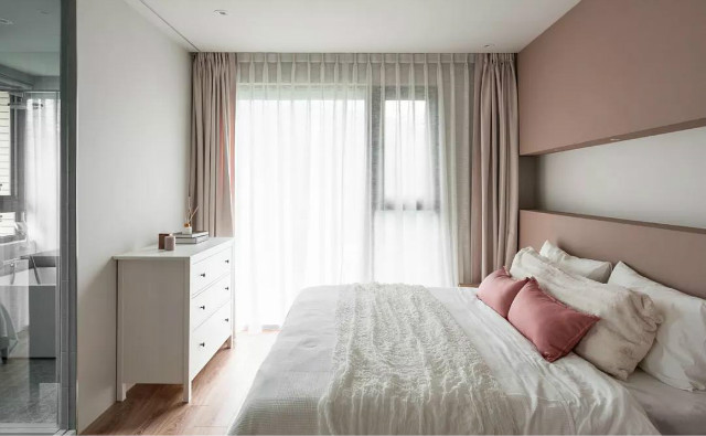 将两房格局整并为一房的女主卧,为提升使用便利性因此不以实墙隔间划分更衣室,而是透过浅隔间形塑一条半开放廊道,不阻断视觉使寝室更显开阔。