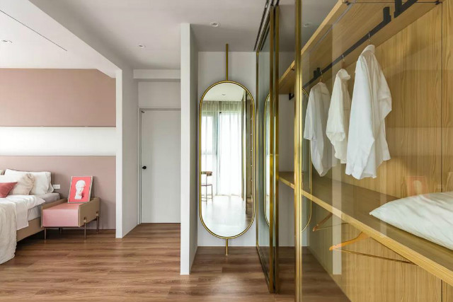 更衣室依循墙面藉由木工+进口五金,砌筑一道洗链通透的木质玻璃衣柜,既符合女主人的吊挂收纳的习惯,在金属缀饰下,呈现高端不俗的居家品味。