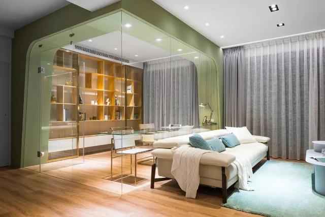 一般来说,建议以清玻为隔间材,再采用玻璃贴便能呈现各式效果,也便于日后做更换,但若是家中有幼童则不推荐,容易发生碰撞也易使玻璃脏污,难以清洁维护。