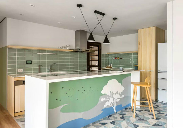 中央吧台除了加深尺度满足倚坐舒适度外,也在台面设置四面玻璃,让抽屉中的精美瓷器与异国零食成为俯瞰的一抹端景,同时正立面也绘饰象征「候鸟归巢」的大树、飞鸟图案,借此传达出家的真正意义。