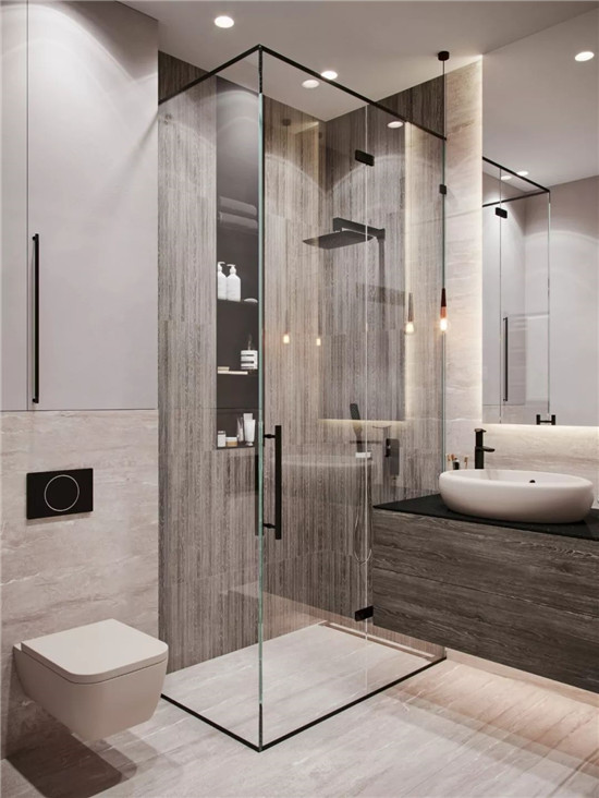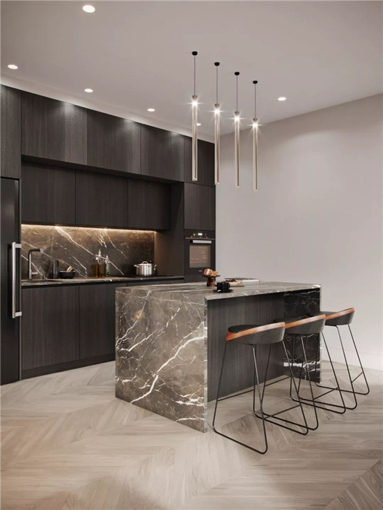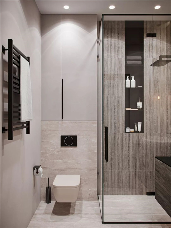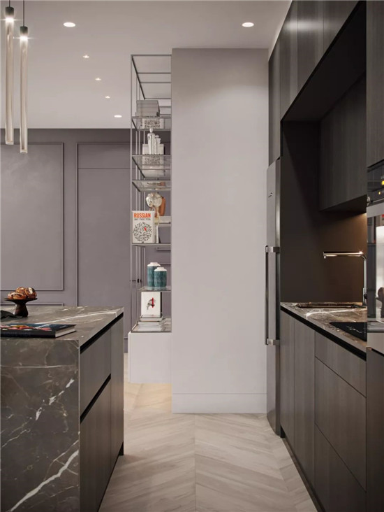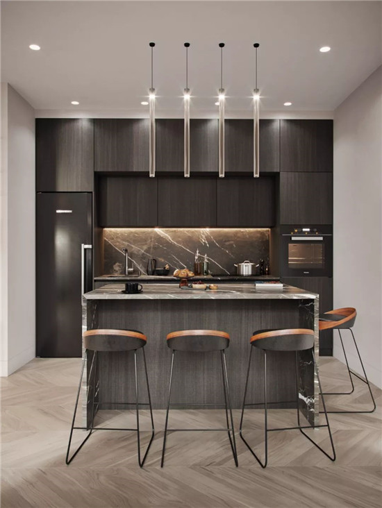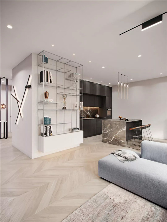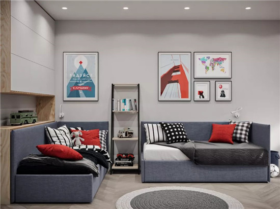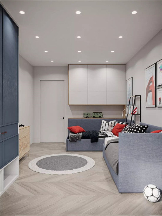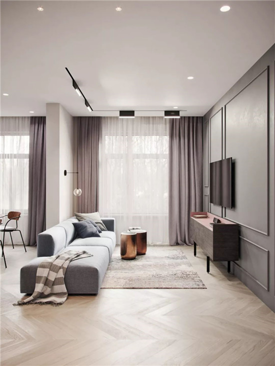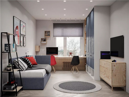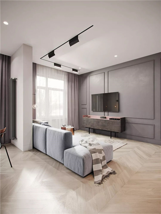 客厅的灰蓝色沙发和深棕色电视背景墙