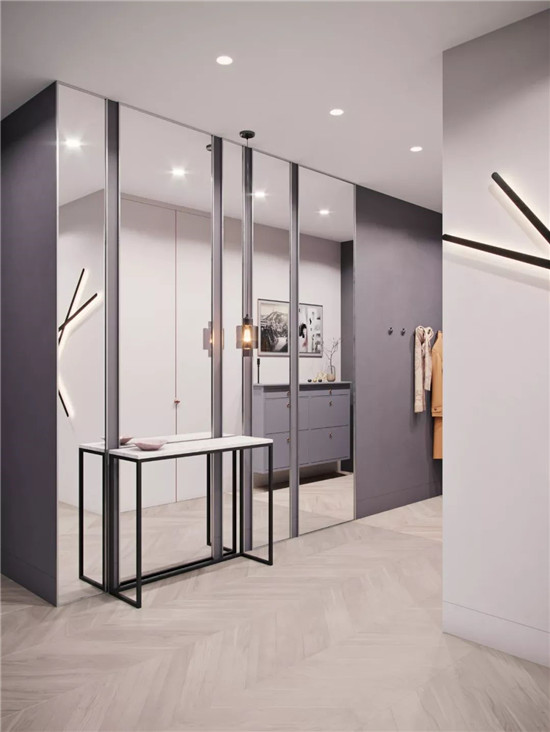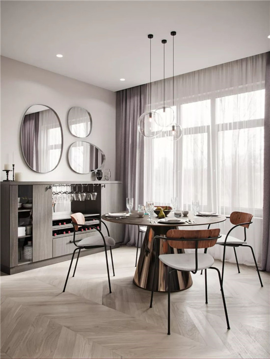 餐边柜上方的气泡状镜子与玻璃吊灯