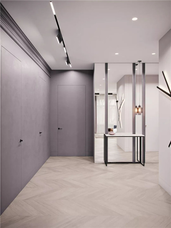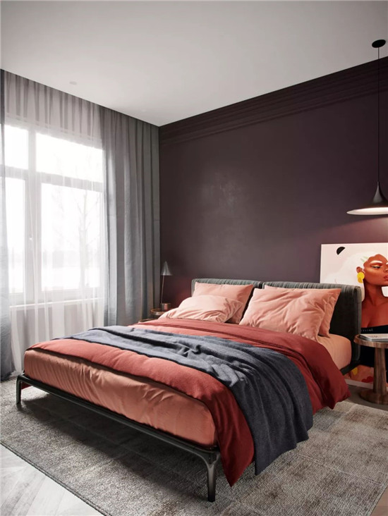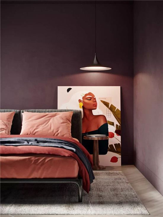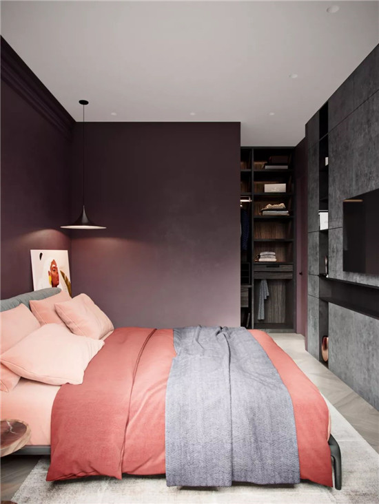 主卧珊瑚橘的床铺与黛紫色墙面相得益彰