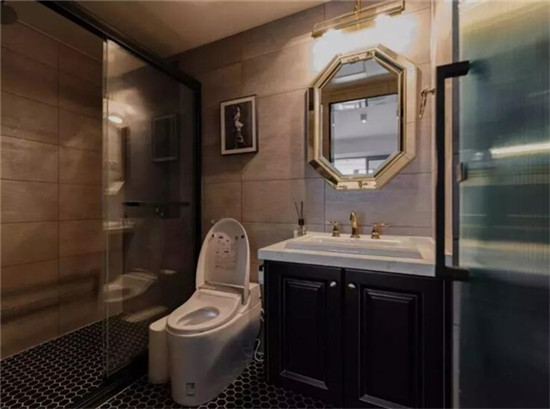 次卧沿用了一样的调子,黑色床头灯让空间对比更加鲜明,金色在这里当作高光一样的存在,实际上起点睛作用。