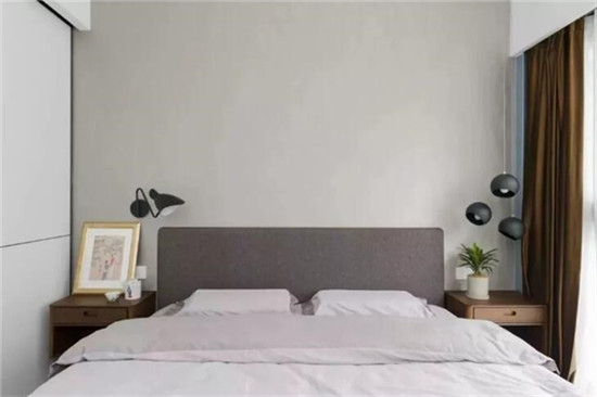 仍然是相当的克制,灰色的床头配浅灰色墙面,完全不出预料,灰色配粉色是一种相当惊艳的设计,但是这里被低调含蓄的表达,酒柜是这个空间的一大亮点,它营造出丰富的材质和透视效果,来丰富卧室的情感表达。