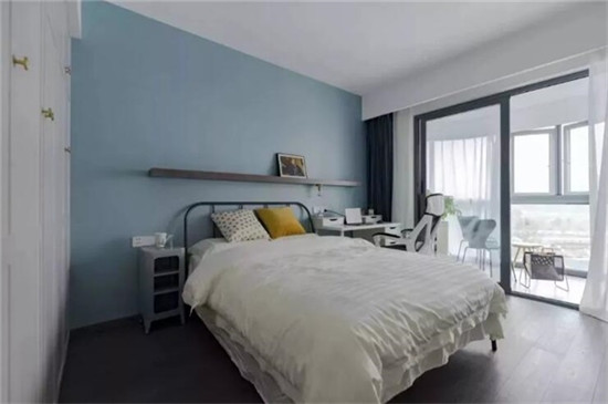 蓝色给人清爽安静的感觉,是儿童房的常见选择,是一种淡雅的蓝色,这里减少了深色的使用,提升了空间的亮度,家具和窗帘都是白色的,空间最后看起来比较明亮、活泼。