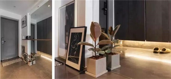 设计师为了平衡视觉,在原有的两个门洞后面接着做了一个很深的储物柜,目的是为了让三个透视隧道并列在一起。