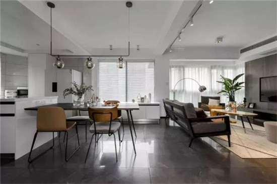 客厅 、餐厅、厨房都在这个开放的区域里,他们在视觉上的划分并不特别突出,主要通过地毯和垂线吊灯的暗示来实现,很巧妙,没有问题。