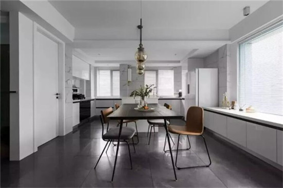 白色橱柜和大理石墙面简洁、素雅,黑色作为点和线的方式增加视觉深度,并营造了连贯清晰的视觉线索,这是面对一大片白色的人所需要的。