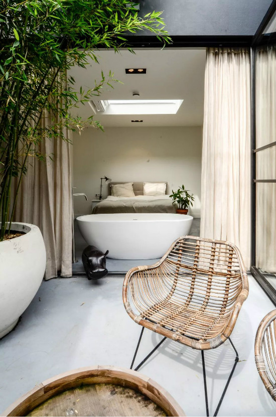 如果是空间面积允许的情况下,千万别错过今年大热的天蓬床,它赋予空间如同艺术装置般的框架感,再搭配上纱幔等小装饰,能增加浪漫的度假气息。
