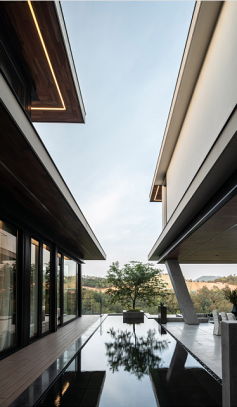 围坐在户外混凝土下沉式围炉区,嵌入自然中去,倾听耳畔的流水,感受跃动的火光。建筑和室内的关系、局部和整体之间、人与自然交融无间。透明悬空的泳池,似一个晶莹的蓝水晶漂浮在山间,黑夜池底部闪耀点状灯光,有如水中繁星,遥应星际宇宙的广博。