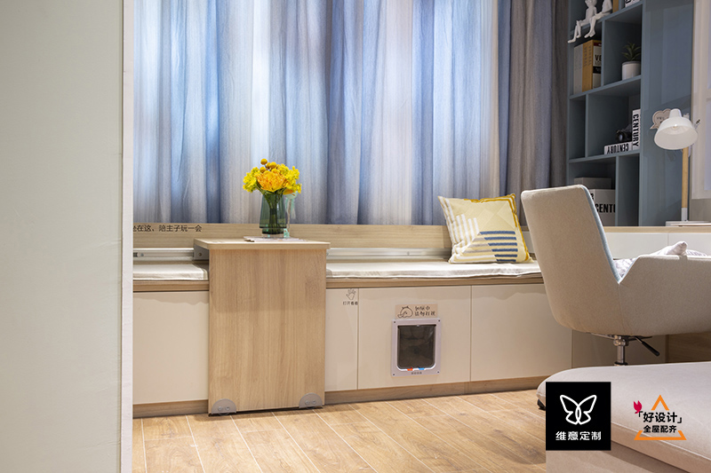 宠物们私密的小餐厅,在这里吃饭不会被外界打扰。餐边柜的底脚一般会做到10公分,这里为了宠物方便使用,只做了5公分,猫狗吃饭的时候更舒适。
