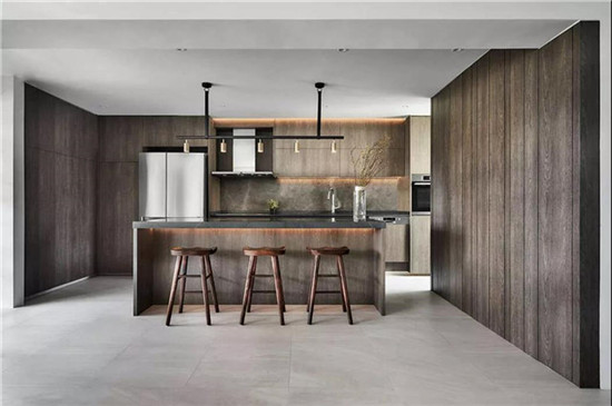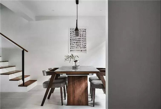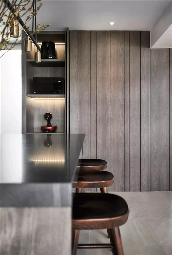 餐厅采用了同样的深色胡桃木材质