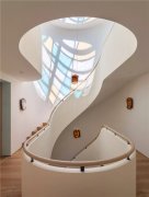 比利时住宅改建 彩色玻璃的天窗投射到房间内的白墙上, 让色彩也加入了时间元素。 客厅选用的材料与色彩呈现出淡雅与沉静, 沙发不规则的排放凸显客厅活泼之感。 房间中最重要