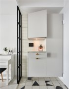 生活简单点,心情就轻松点,每一天都能像度假般,有时间和精力慢慢品味点滴时光。 进门正对吊装鞋柜,无暇的纯白色,暖黄色筒灯柔和了线条和色调。 玄关另一侧简单设计了挂衣