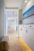 90㎡的装修案例整体以淡蓝色为主格调,步入家中像来到海洋一样清新自然,也不会觉得非常拥挤。 玄关 玄关的右手边有一个鞋柜,上面是蓝天白云的装饰画,鞋柜下面做了藏光处理,