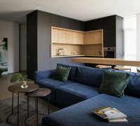 TOT公寓,面积124㎡,透过木色吧台划分厨房与客餐厅,深黑厨柜、灰蓝短绒沙发,与乳白墙、米棕人形拼地面交织一股沉稳都会感。房子设计整体无需渲染华丽的色彩,无需堆砌繁杂的