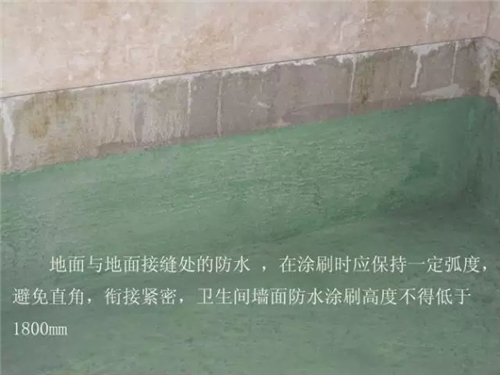 (十三)卫生间地面一定别忘了做防水,特别是地面开槽的。淋浴区如果不是封闭淋浴房的话,墙面防水应该做到180厘米高,以防日后“墙体出汗”。在抹水泥前一定要做24小时闭水试验,没有问题了才能铺砖;