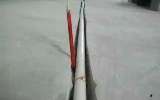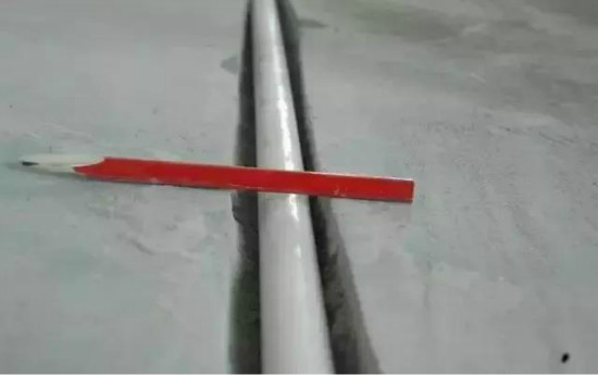 线管铺设完毕后,比较专业的师傅还会做二次验收,避免封槽后出现不必要的麻烦。这个小技巧操作其实也是很简单的,只用一根铅笔就能验收。如下图所示,线槽的深度够不够,线管有没有凸出来,将铅笔水平放即可;同时,也可以用它来测量线槽的宽,只要将其插在线管的两侧即可。看似简单,却非常的实用,如果师傅没有做,业主自己也可以做。
