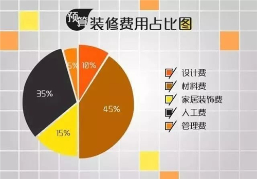 家居装修中的总费用=设计费(10%) 材料费(45%) 家具装饰费(15%) 人工费(35%) 管理费(5%)。