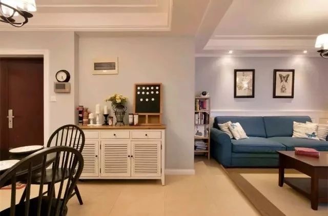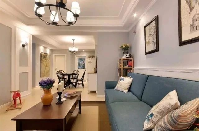 蓝灰色的沙发背景墙面,下半身做成半护墙,搭配深蓝色沙发,以及深木色茶几,还有咖啡色的窗帘,温馨的感觉满满。