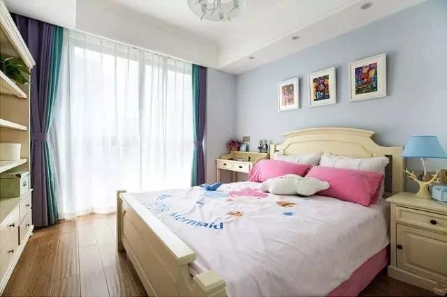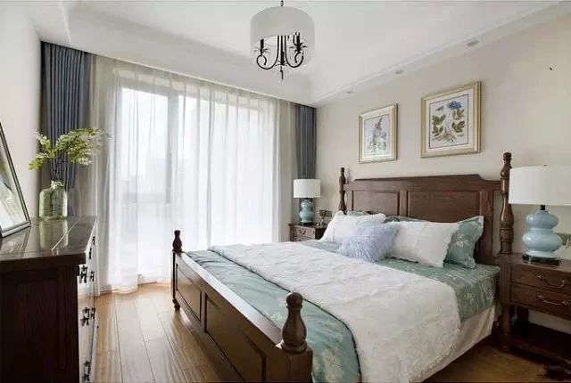 如图次卧用被套搭配出了美式田园的感觉,显得非常静谧温馨。