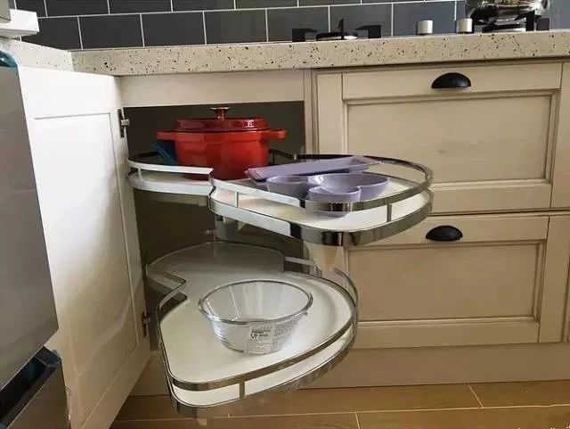 中式厨房整体用了美式标配的地铁砖,厨房小转角的飞碟非常实用,把橱柜死角利用起来,不规则的厨具终于有了去处。