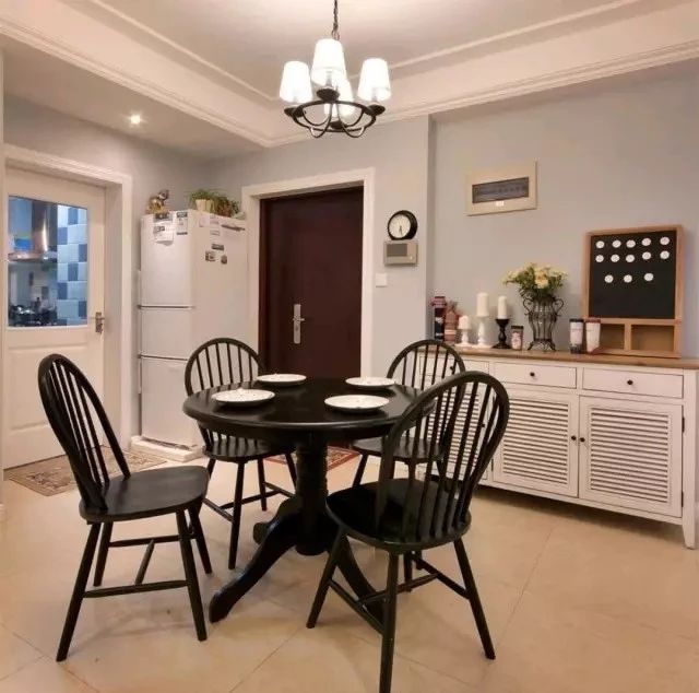 卡座两用,在满足用餐需求的同时还能储物。由于原始布局中入户门与厨房门相对,而业主在意风水,于是设计师把厨房门移动扩大,嵌入了一个冰箱,双扇玻璃推拉门又正好提高了客厅和餐厅的采光。
