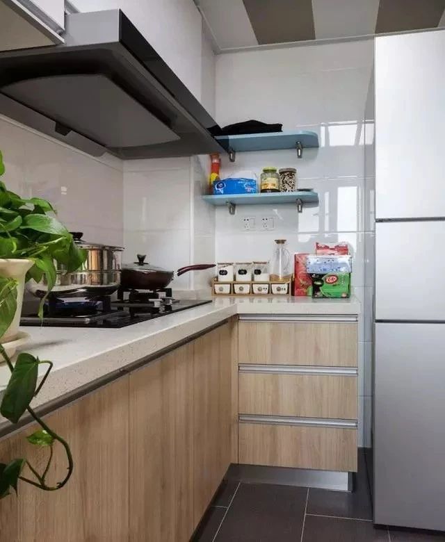 蓝色与浅色瓷砖让整个厨房富有生机,墙面的一字隔板收纳功能强大。