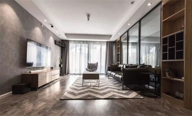 卧室中放个书桌就能同时兼顾书房的功能,与客厅之间只隔了一个黑框推拉玻璃门,既增加了房间采光,又没有实体墙的压抑感。