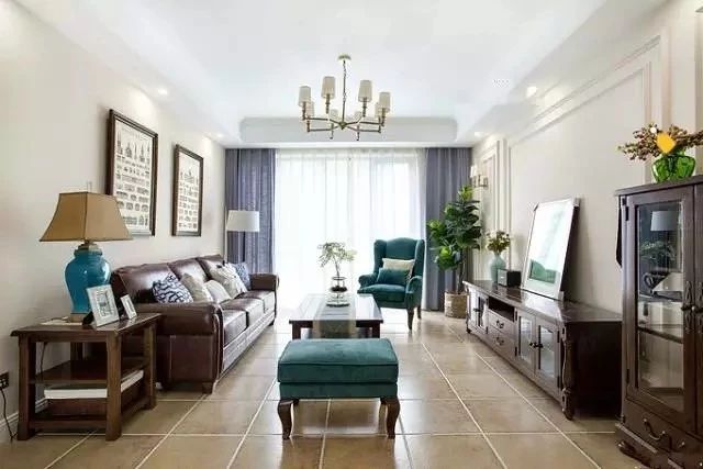 客厅整体方方正正的,大大的落地窗,稳重的油蜡皮沙发,经典美式的台灯与落地灯,是很多人心中的美式。电视柜边上的展示柜,颜值高且实用,可以收纳可以收藏。