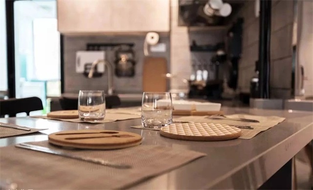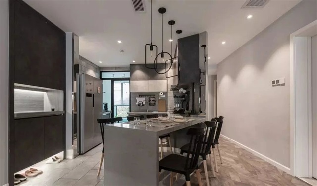 隐藏在灰墙中的收纳柜突出风格又实用。玄关紧靠餐桌,一进门就能看见满桌的食物。