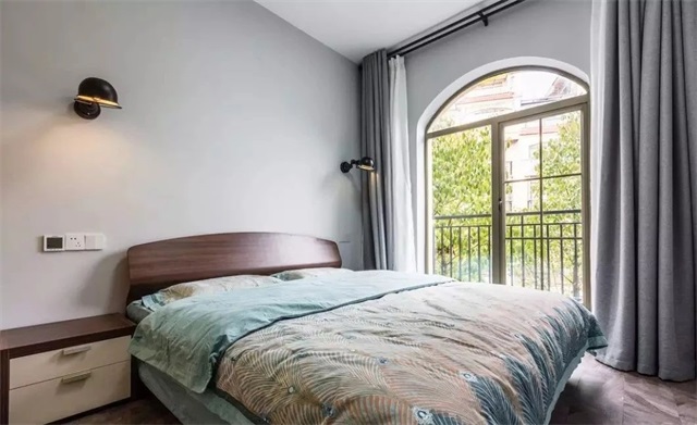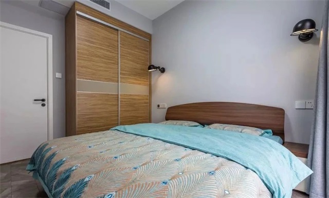 床头背景墙采用蓝色暗花墙纸,丰富的墙纸省了做背景墙的钱,再用搭配蓝色暗花的被子、枕头,整体完美呼应,营造出一个浪漫又舒适的卧室。