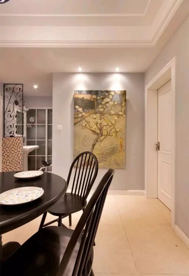 入户门的对面墙采用了一幅抽象派油画,顶面两盏灯光的照射下,使墙面变成独特背景墙,吸引眼球。