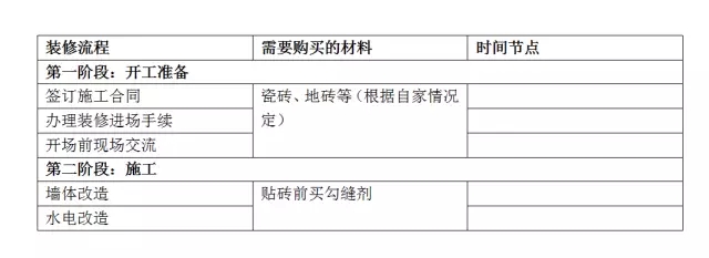 在开始装修的时候,装修公司应该会给你一份他们的装修进度表,记得把上面的时间节点写到你的预算表上,在上面标注出每种建材的最晚购买时间。这样,你就很明确自己在什么时段需要购买什么建材了。