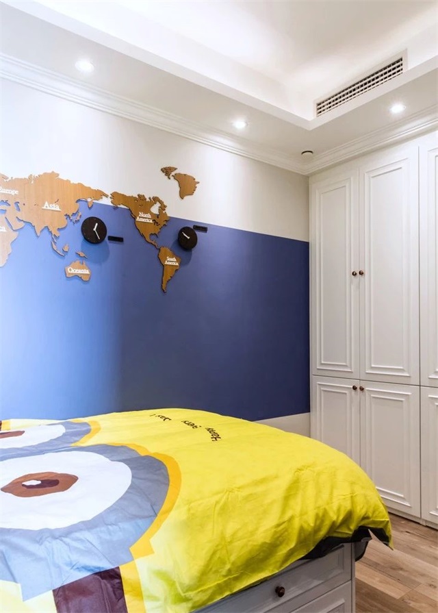 儿童房采用了和客厅墙同样的处理手法,床柜一体的家具提供了大量的收纳空间,还腾出了学习区的布置空间。
