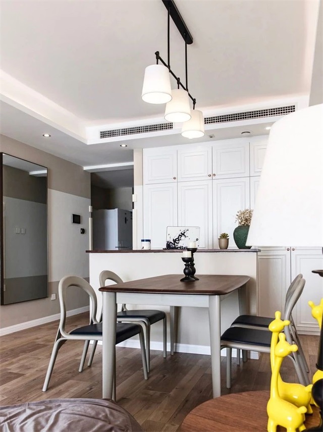 餐厅在餐桌和收纳柜中间增加了一个小吧台,实现空间功能区叠加,也让整体的布局更加紧凑了。