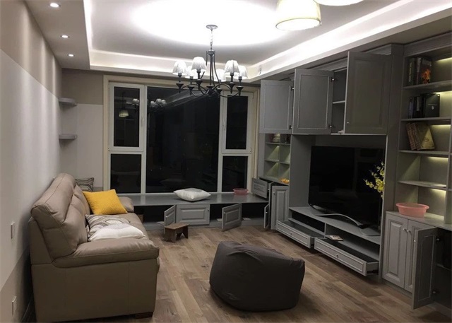 硬装完工之后的样子,空间格局有了很大的。8米长大客厅,靠近落地窗设计了休闲小飘窗,还是带储物功能的。
