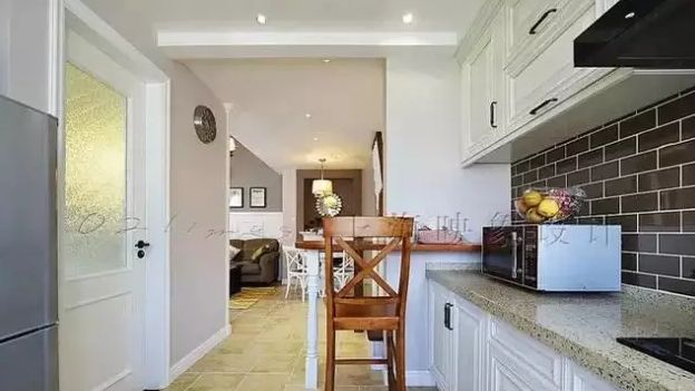 地面和墙面:一般为瓷砖,但也有少数业主地面会选择用地板,用地板一般适宜不怎么烧饭的家庭,另外墙面砖不建议选择暗色系,(地面砖可以,耐脏、易清洁),考虑到厨房的采光效果,避免空间压抑。