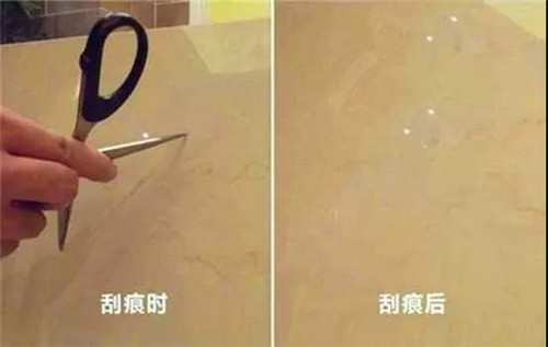 用钥匙或小刀直接在瓷砖的表面用力划一下,能划出痕迹的是劣质砖。耐磨性能好的瓷砖,用刀划过是没有痕迹的。来源:装修得意家